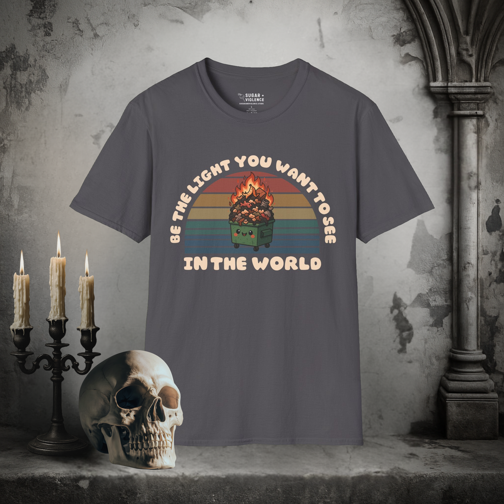This tee features a flaming dumpster with the phrase “Be the Light You Want to See in the World,” blending ironic positivity with unapologetic goth energy. Perfect for anyone who thrives on sarcasm, alt fashion, and a little bit of chaos.