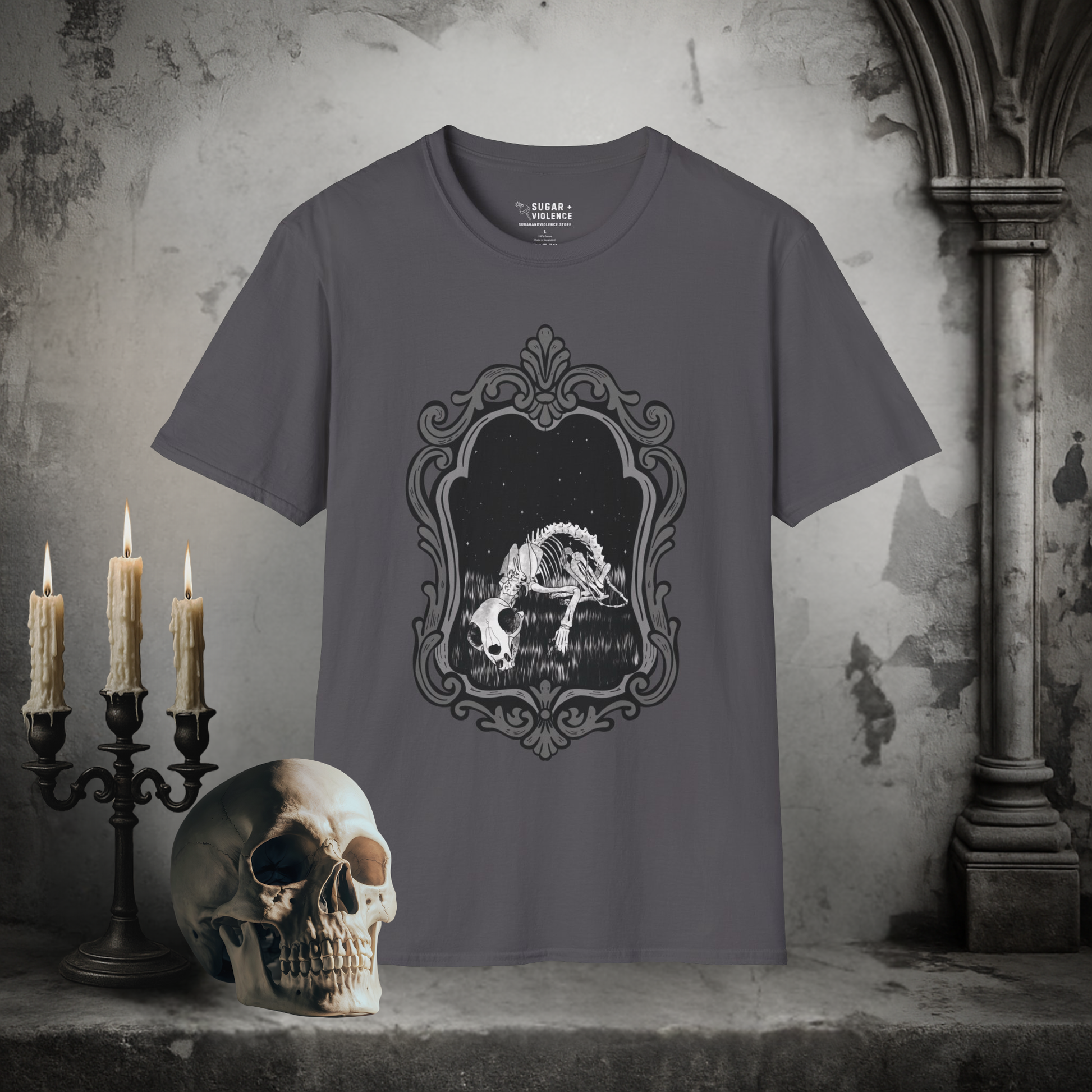 Emerging Artist Gothic Skeleton Tee – Boneyard Mirror Graphic